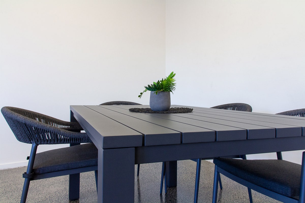 - The dining table features a robust rust free aluminium frame in a modern charcoal colour
