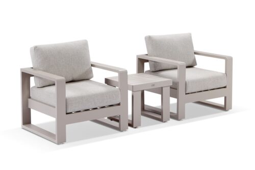 Unwind in style with the Harbour chair set. Designed with elegant, rounded armrests and sleek sleigh legs, this aluminium set brings a modern twist to timeless comfort. Perfect for morning coffee on the balcony, relaxing in the garden, or a quiet evening in the conservatory, it’s built to last with a rustproof frame and plush textured Olefin cushions for everyday luxury.