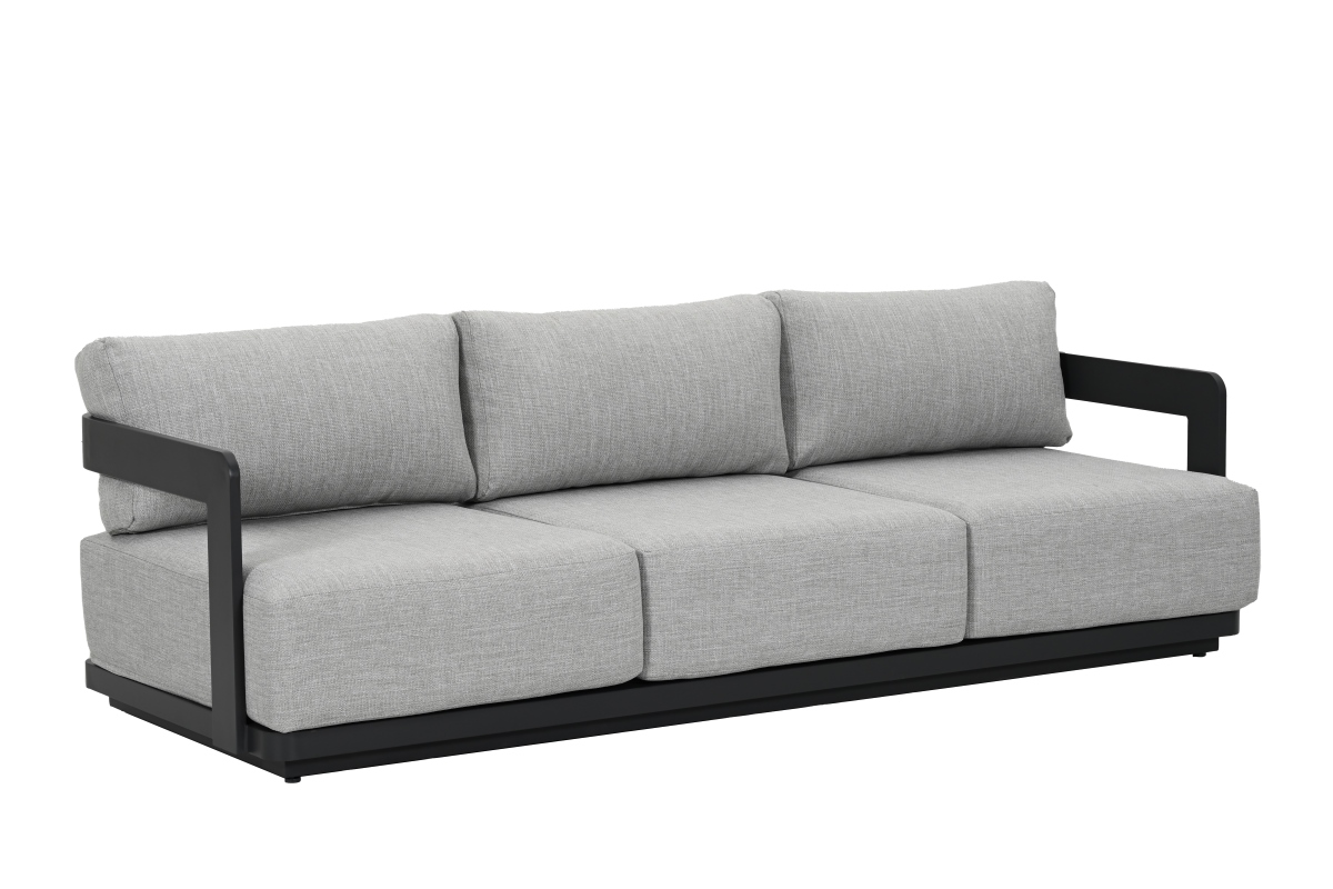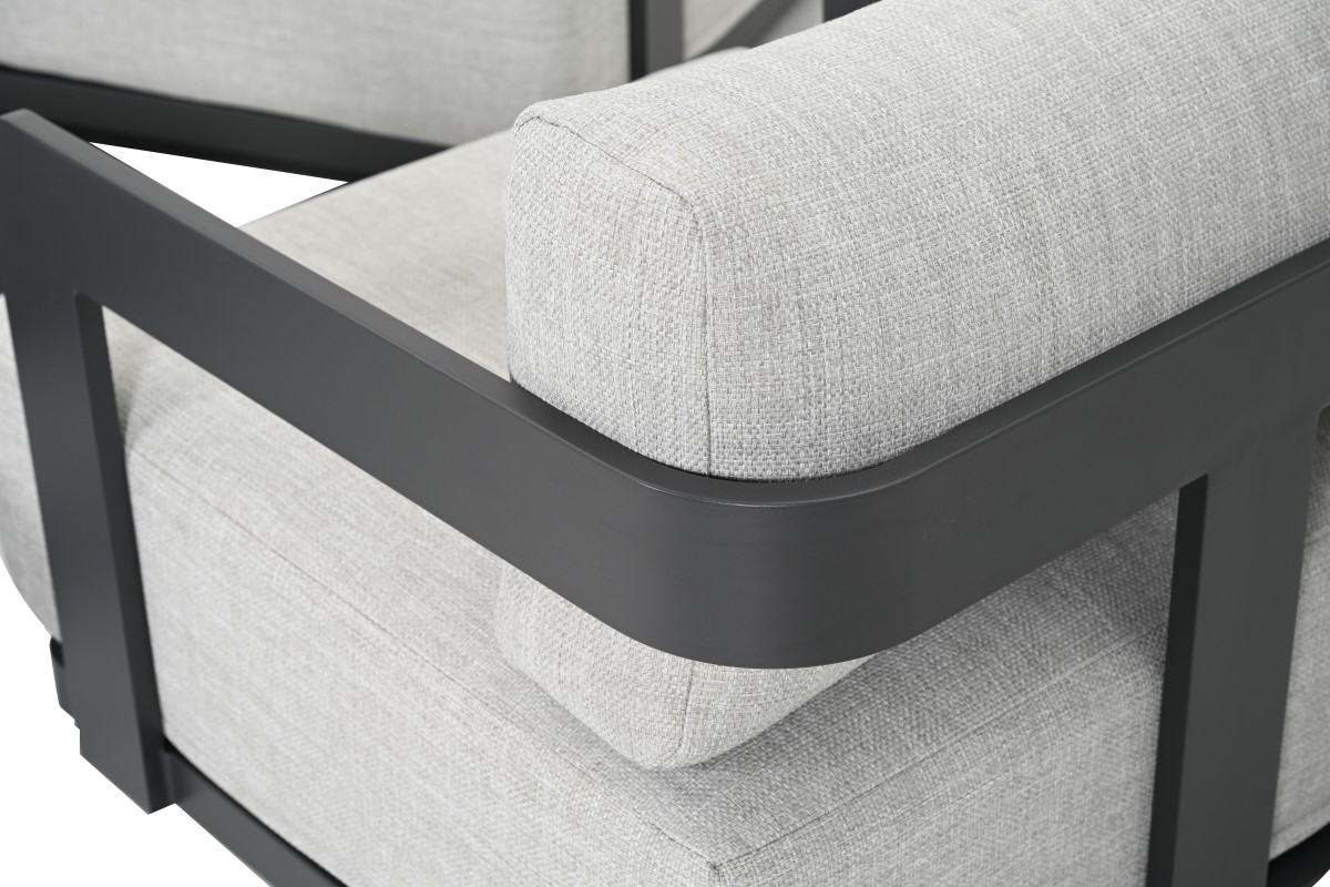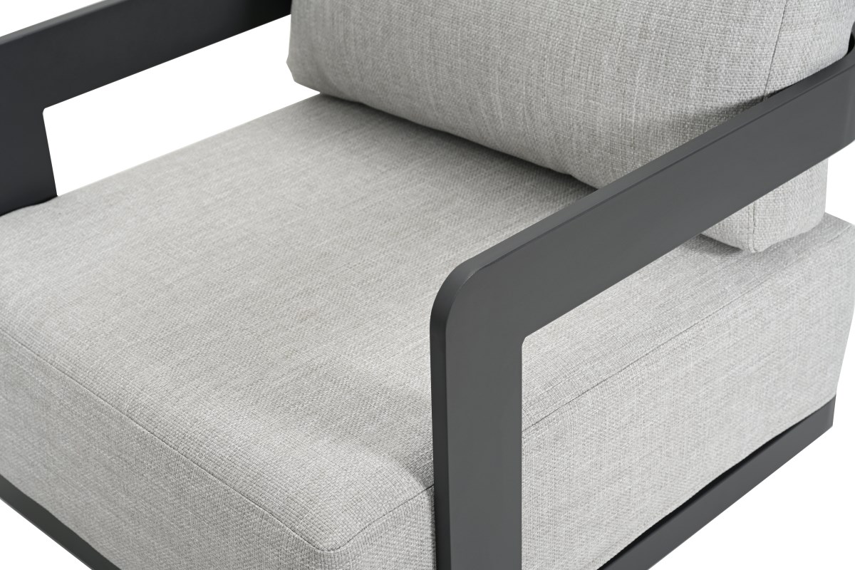 Relax in the modern aesthetic of the Laguna outdoor lounge with its contemporary lines and deep seating. Gather for memorable moments and serious relaxation on this 4-Piece Outdoor Lounge Setting. Supported by a robust aluminum frame with its simple form and rounded corners, this set includes two armchairs, a 3-seater lounge, and matching coffee table, perfect for any occasion. Sink into plush quick dry foam cushions wrapped in a textured soft olefin fabric for the ultimate outdoor seating experience.