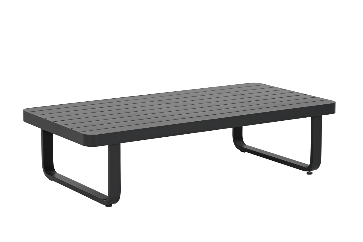 - An aluminium rectangle coffee table matches the set and comes with a slatted top and soft rounded corners