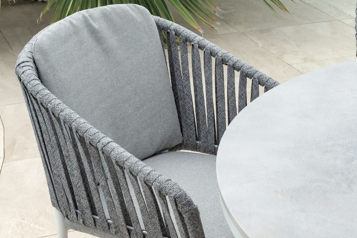 Contemporary outdoor style with the White Palm Dining chair from our rope outdoor collection. Featuring a curved flat rope back with an Olefin seat and back cushion for ultimate comfort.