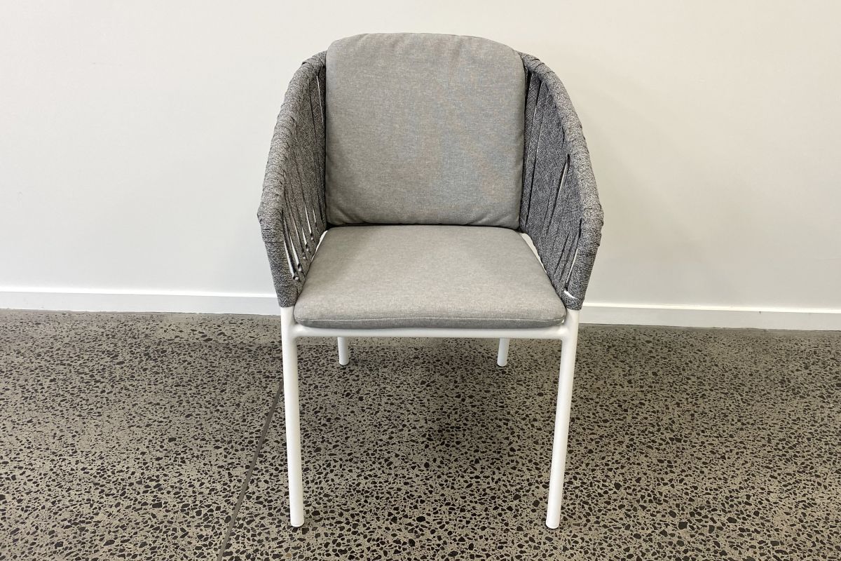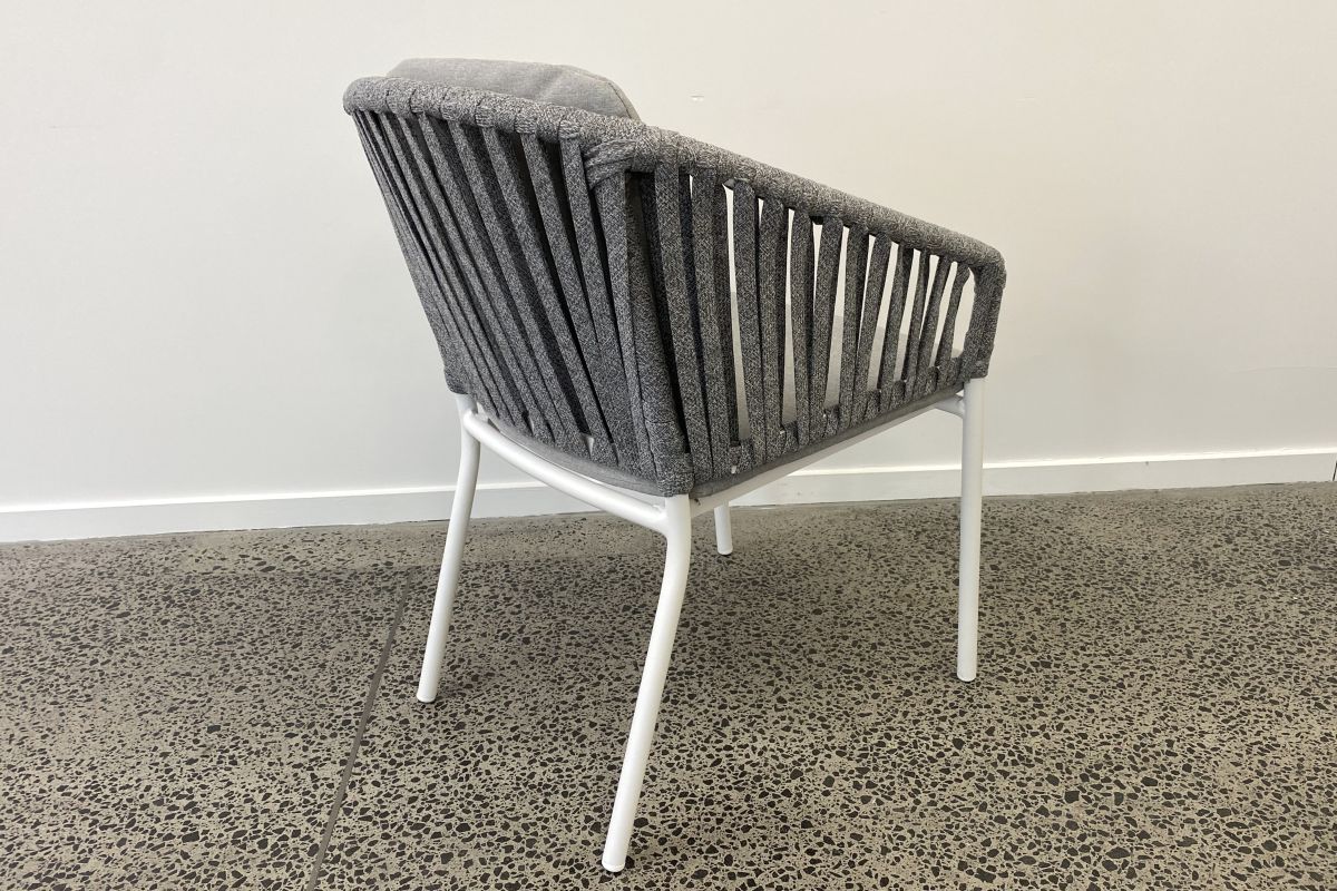 The Palm white chair has a stunning hand woven wide flat rope back made from solution dyed polyester. It has a comfortable seat and back cushion made with Olefin outdoor fabric and foam. The white powder coated aluminium frame is lightweight yet durable, a designer style for relaxed dining in your outdoor space. We recommend pairing with any of the Cove White dining tables to complete the look. Chair cushions can be stored away when not in use.